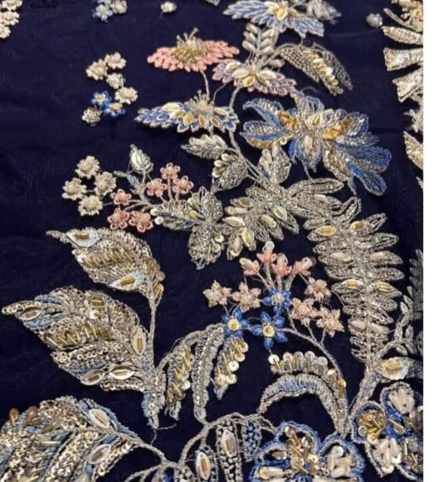 The look is elevated with a luxuriously embroidered organza dupatta, designed with detailed side panels, a net center patch, and embroidered borders for a regal finish. A printed silk inner ensures comfort while maintaining an elegant drape.